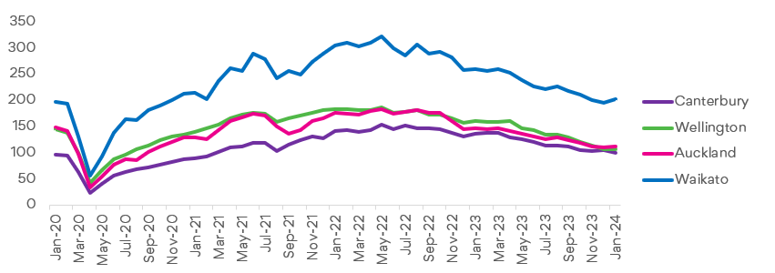 Figure 2: Major region job ad trends: January 2020 to January 2024. Index: 100 = 2013 avg