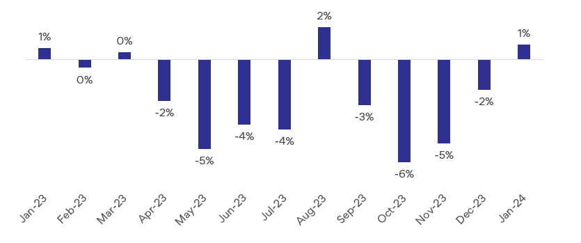 Figure 1: National SEEK job ad percentage change m/m January 2023 to January 2024.