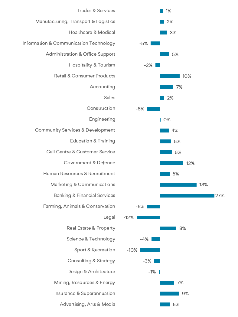 • Information & Communication Technology (-5%) and Hospitality & Tourism (-2%) were the largest industries (by job ad volume) to record a decline in job ads.