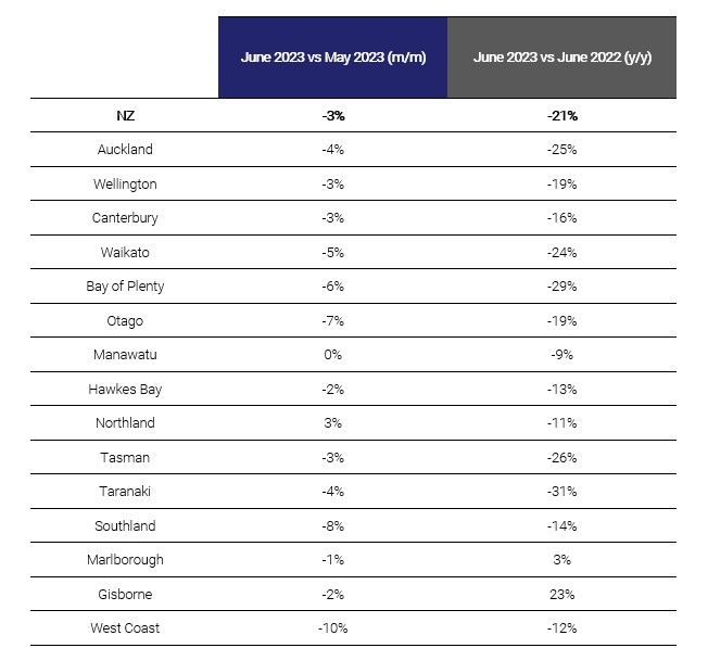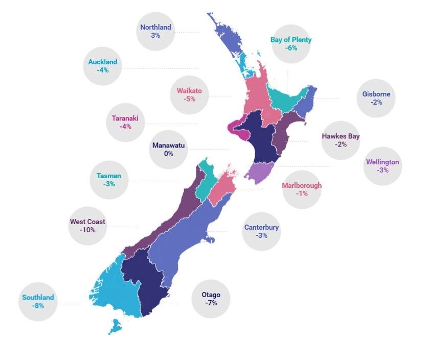 Auckland’s 4% drop in job ads m/m led the overall national decline, followed by Wellington (-3%).