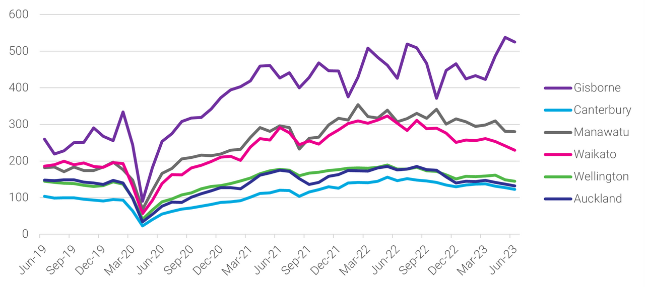Marlborough and Gisborne are the only two regions which have recorded y/y growth in job ads. While both regions are small in terms of job ad volumes, and therefore more susceptible to flux, it is notable that both regions recorded their highest levels in May, and small drops in June have not altered the high demand in either region. Marlborough is 3% higher y/y and Gisborne has risen 23% since June 2022.