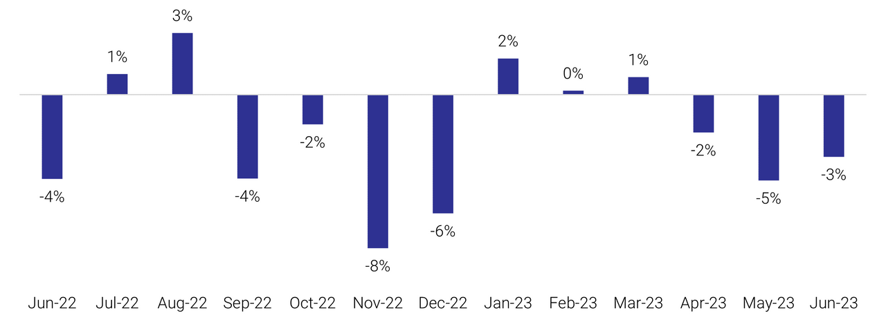 Figure 1: National SEEK job ad percentage change m/m June 2022 to June 2023.