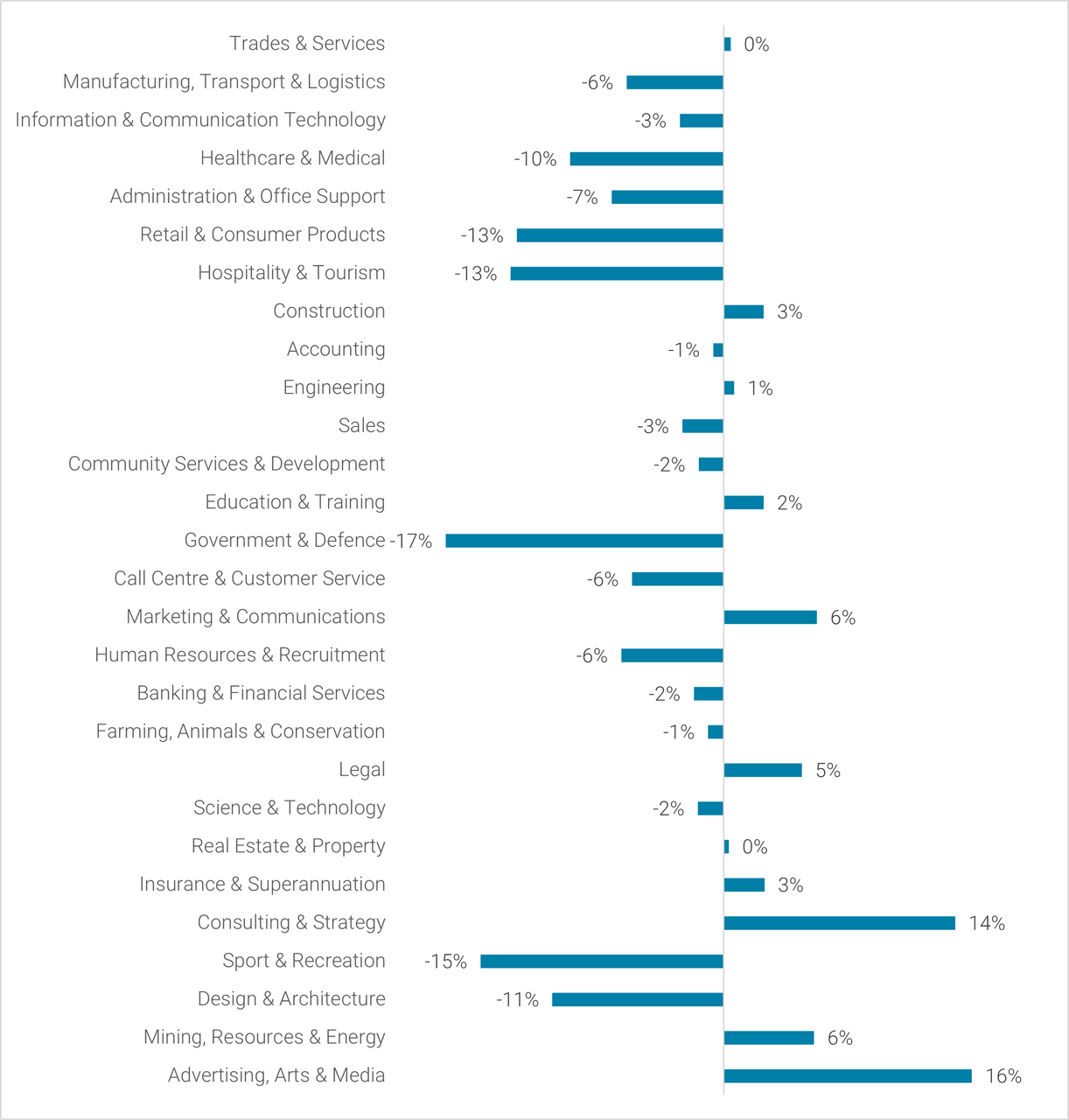 Trades & Services (0.4%), Construction (3%) and Engineering (1%) were the largest industries to have an increase in job ad volume.