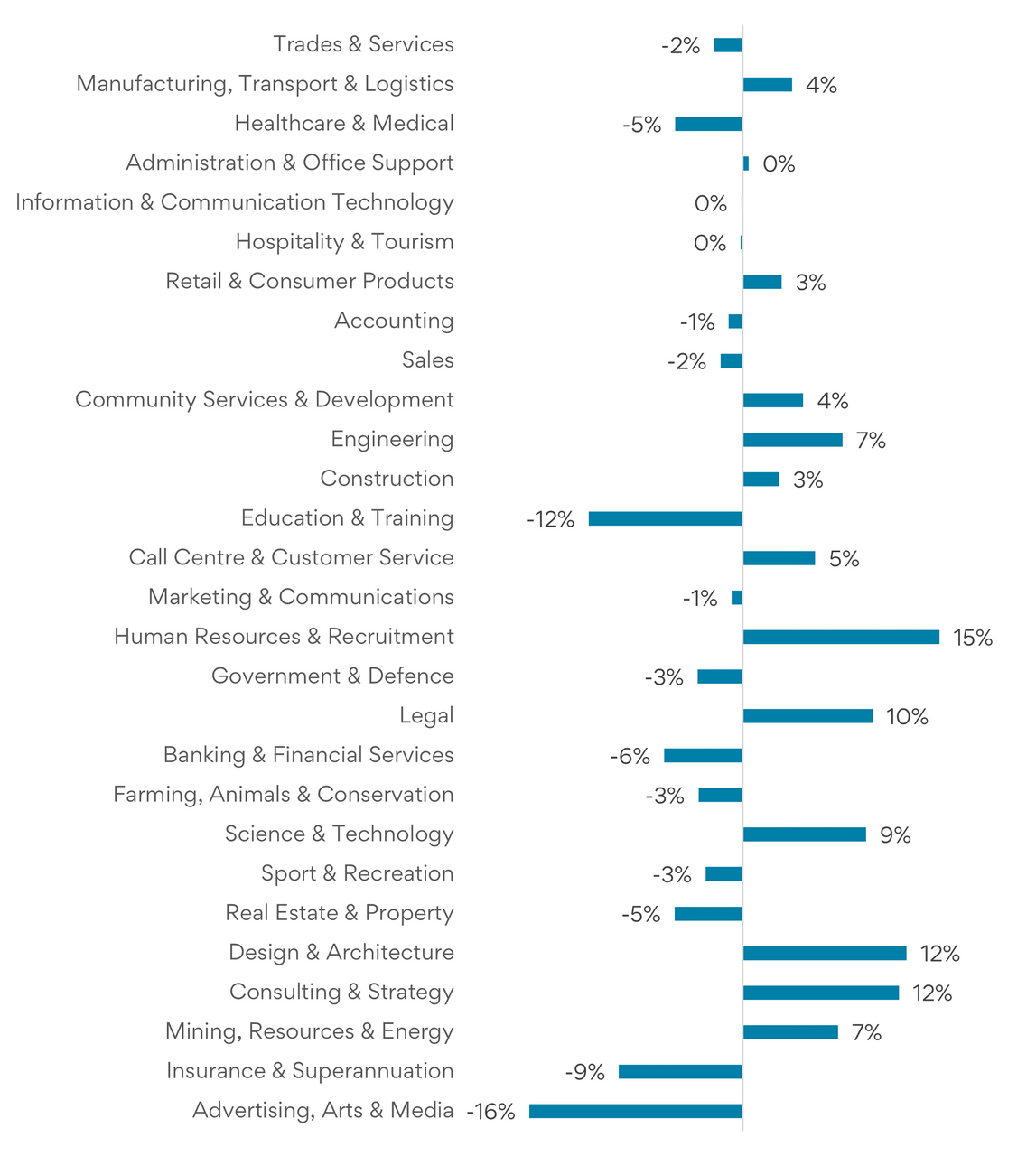 Professional Services roles, including Human Resources & Recruitment (15%) and Consulting & Strategy (12%) recorded the largest increases in ad volumes.
