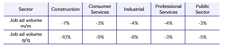 The Construction sector led the monthly decline in jobs ads, with Engineering roles dropping 12% month-on-month (m/m).