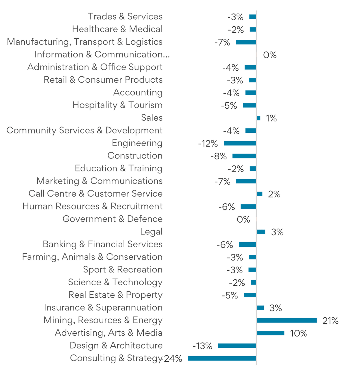 Job ads fell in most industries m/m, but a slowdown in hiring in the Construction sector, including roles within the Engineering (-12%) and Construction industries (-8%) led the decline.