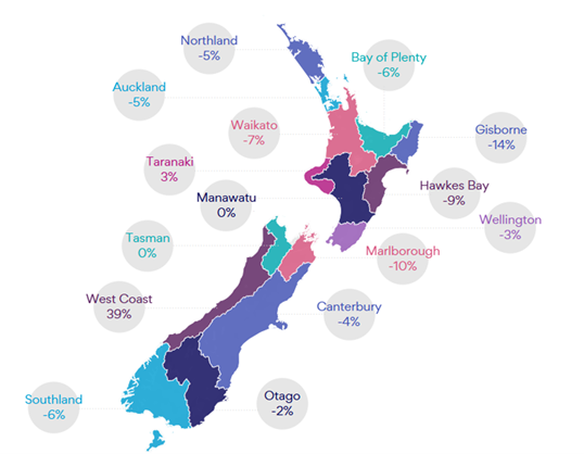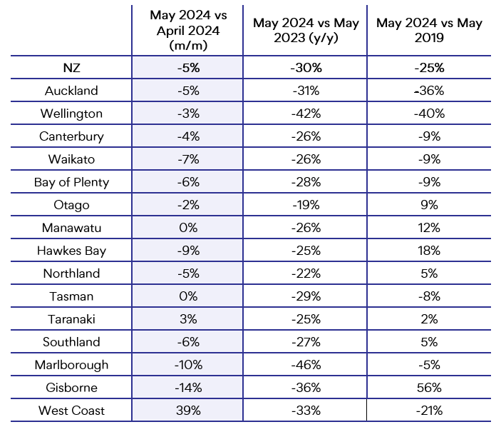 Compared to May 2023, job ads have declined the most in Marlborough (-46%) and Wellington (-42%).
