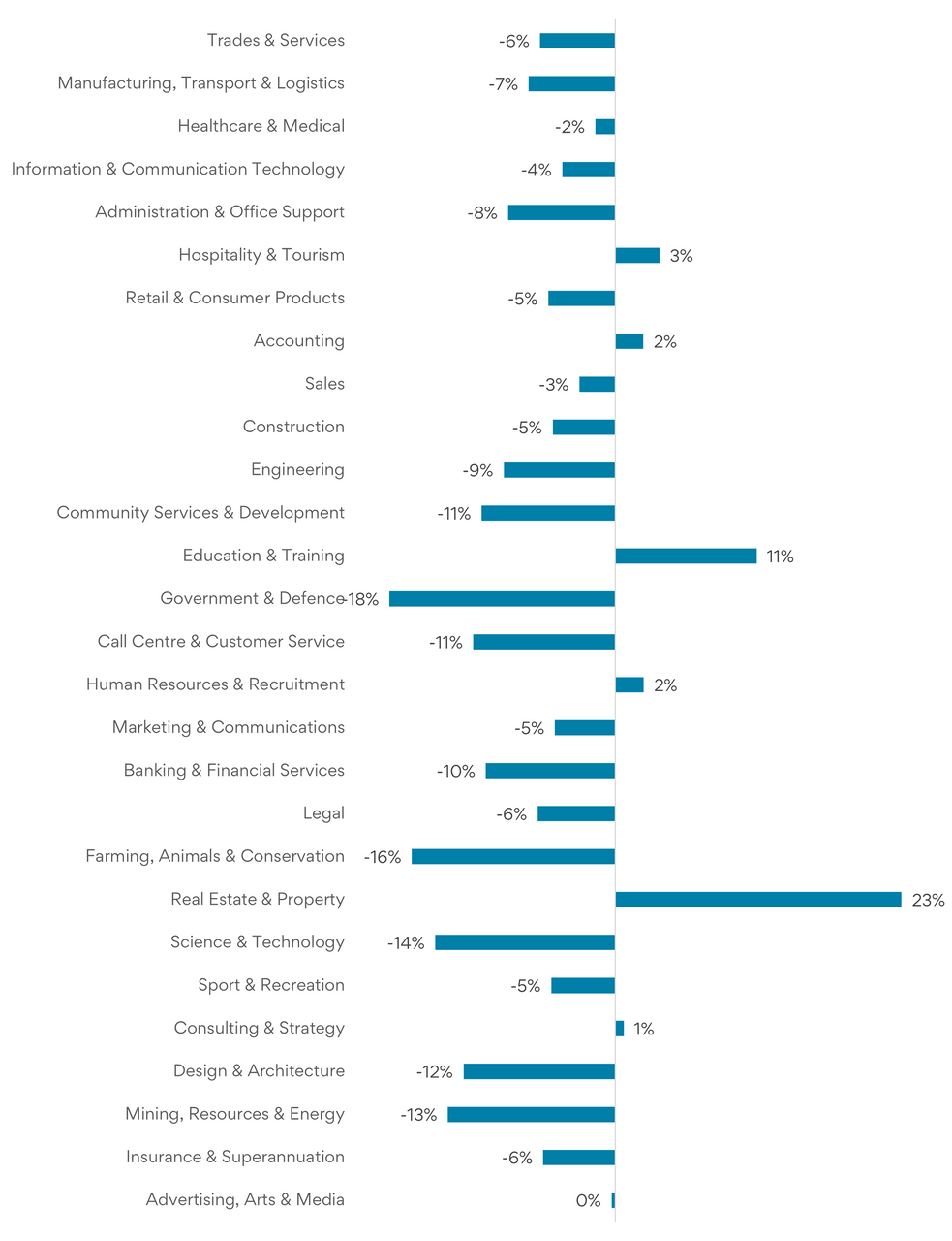 Real Estate & Property was one of the few industries to record growing demand for workers, rising 23%, while job ads in Education & Training.