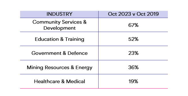 When compared to pre-COVID, some industries are recording higher demand for workers, specifically, Community Services & Development (67%) and Education & Training (52%).
