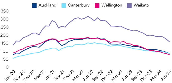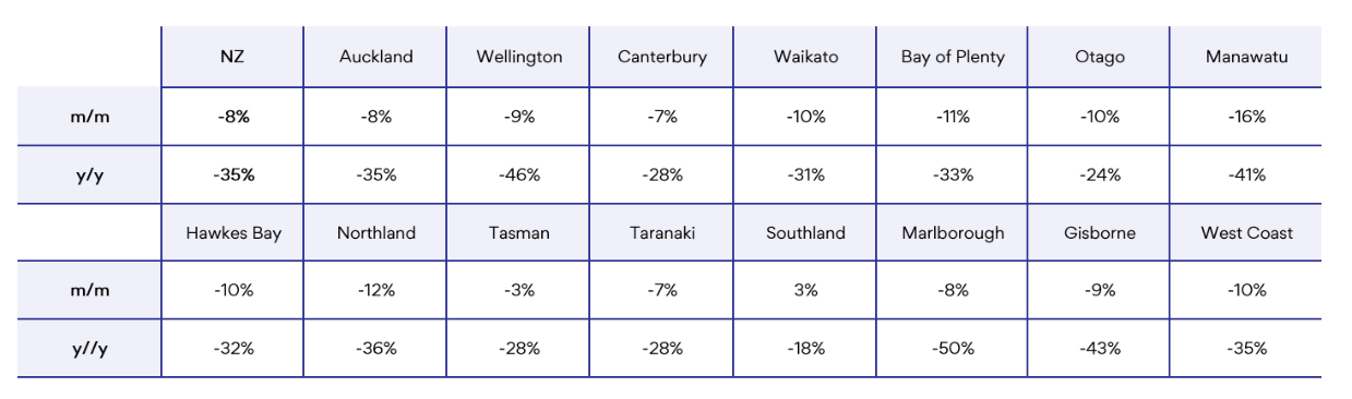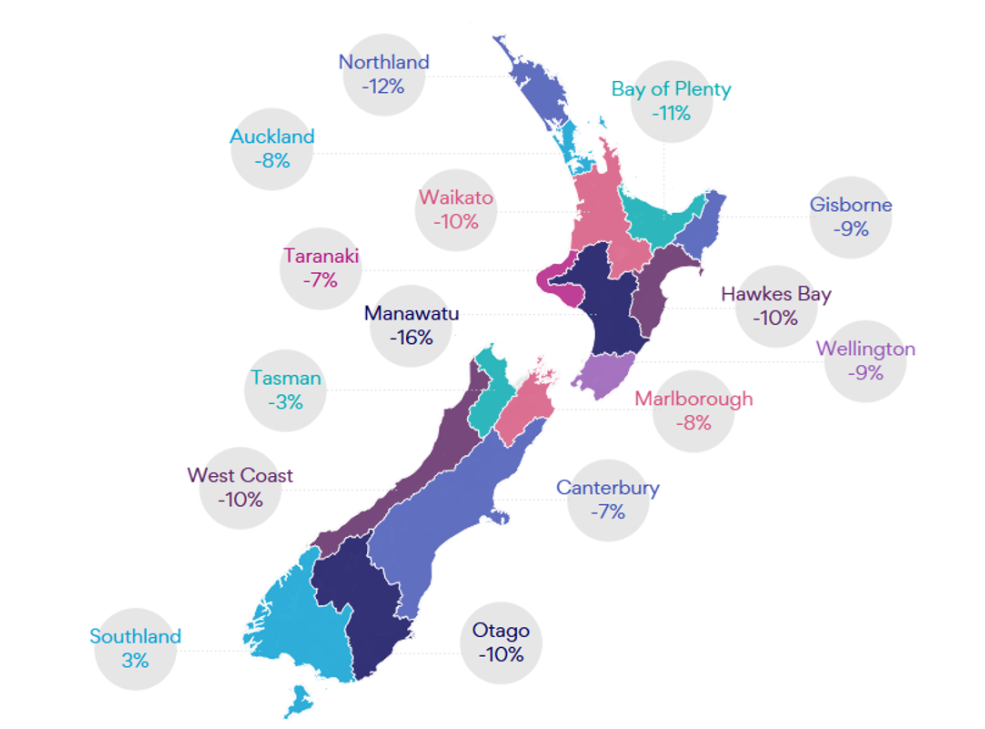 Aside from Southland, all regions contributed to the national decline, led by Auckland (-8%), Wellington (-9%) and Canterbury (-7%).