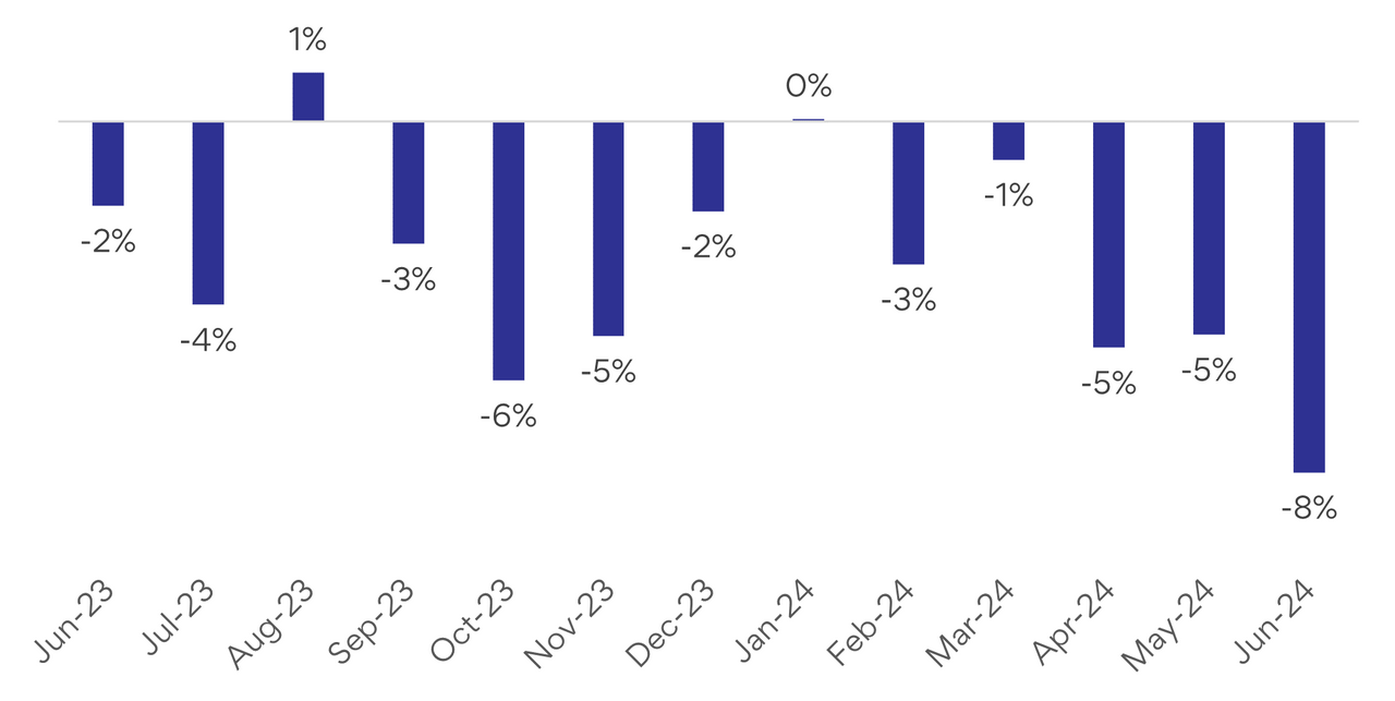 Figure 1: National SEEK job ad percentage change m/m June 2023 to June 2024