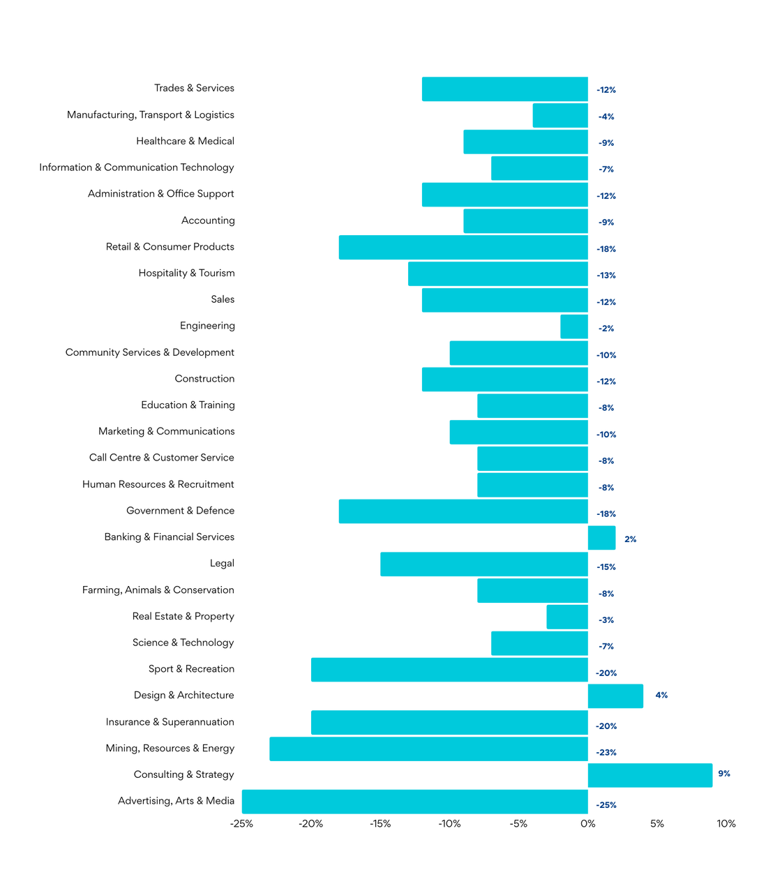 Over the past year, Government & Defence ads have dropped by 59% and Construction has halved (-50%).