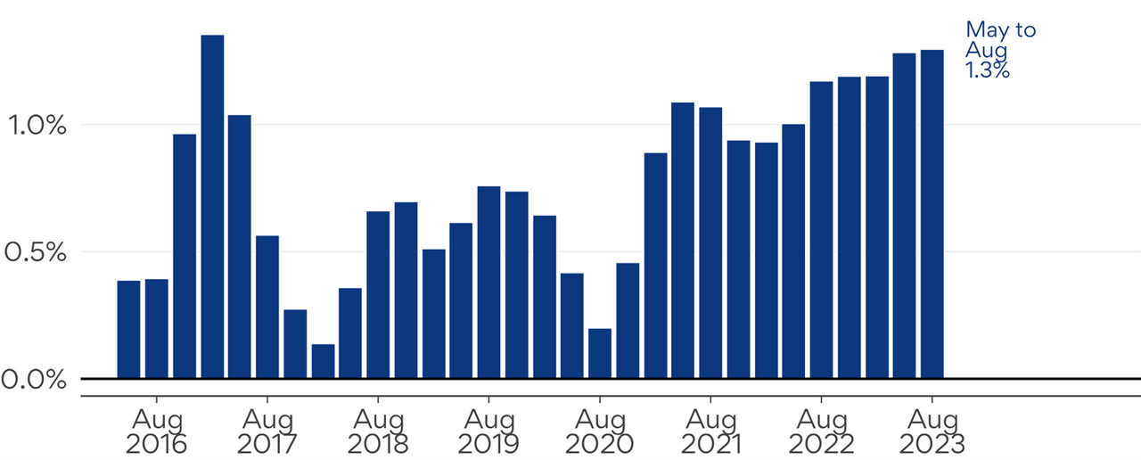 [1] Year-on-year refers to the the quarter to August 2023 (June, July, August) v. the quarter to August 2022.