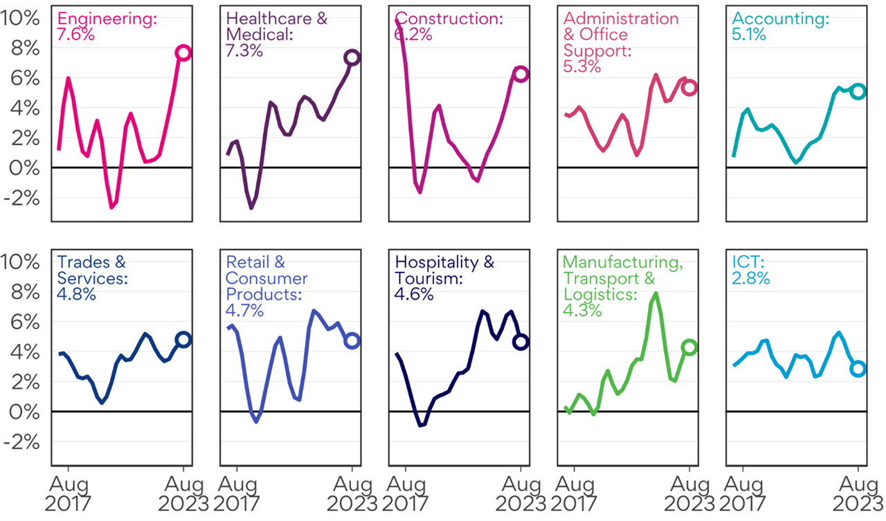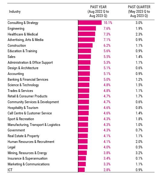 Advertised salary growth in Information & Communication Technology (2.8%) continued to be relatively sluggish, lagging all other industries.