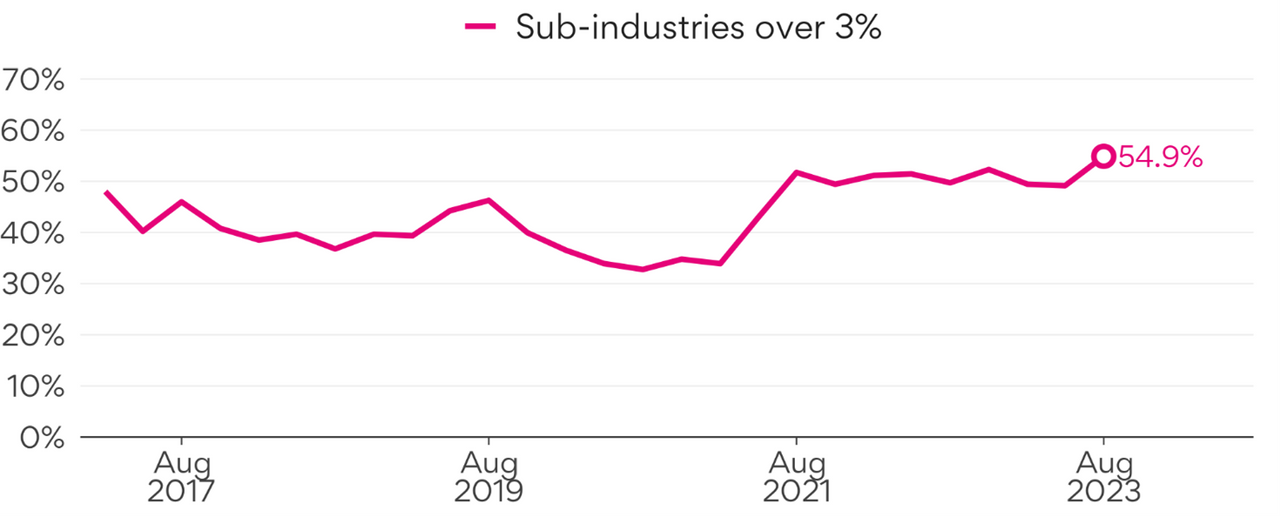 Figure 5: Proportion of sub-industries experiencing 3% or faster advertised salary growth