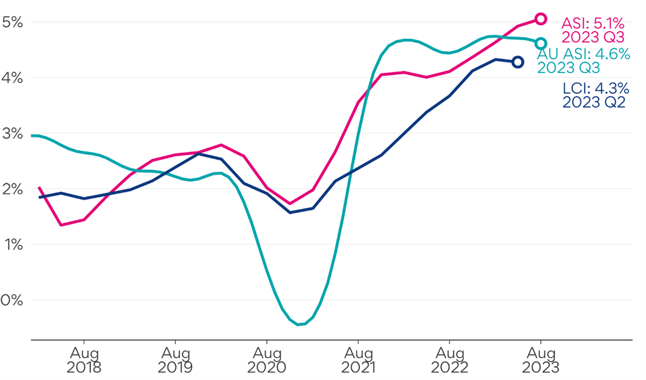 Note: ASI for NZ and AU is the smoothed seasonally adjusted (‘trend’) figure. LCI is seasonally adjusted.