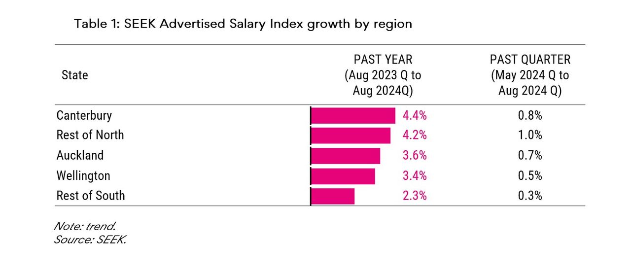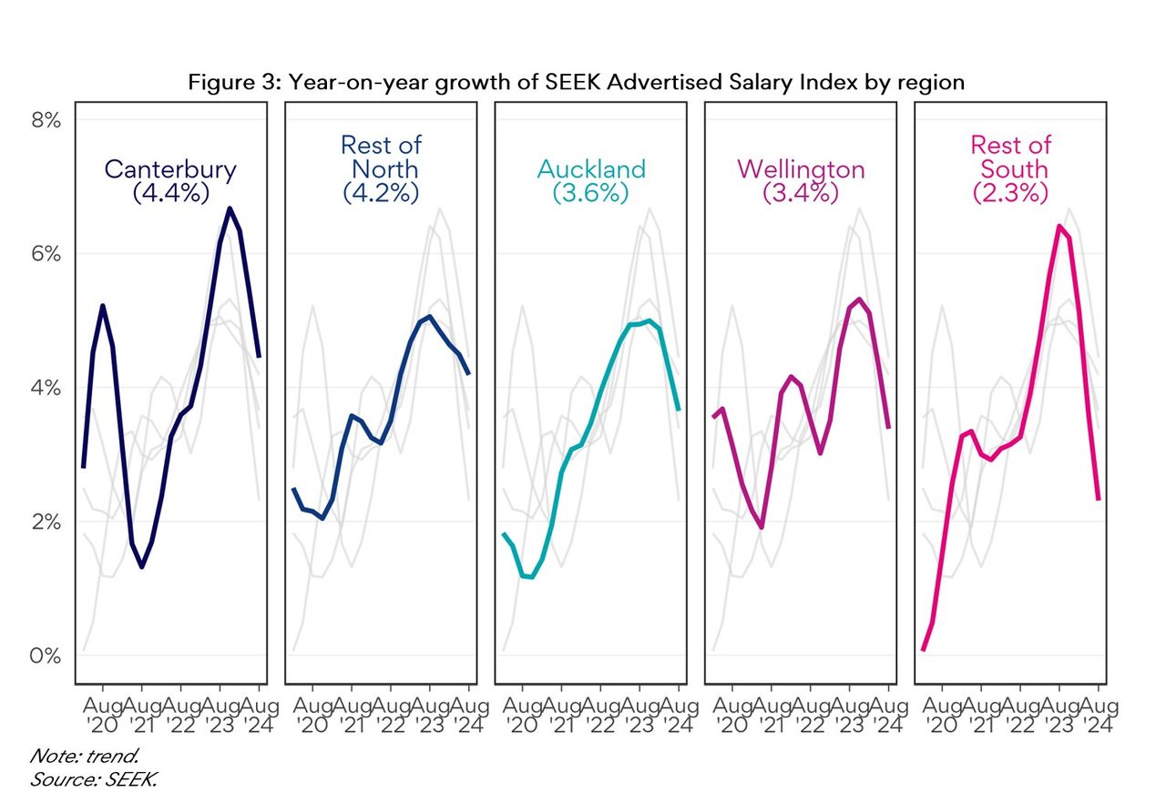 Average advertised salary growth slowed in all regions over the past quarter, mostly in Wellington.