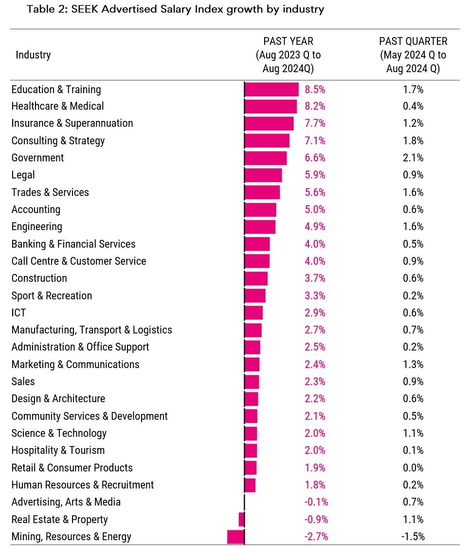 Three industries saw average advertised salaries decline y/y, namely Mining, Resources & Energy (-2.7%), Real Estate & Property (-0.9%) and Advertising Arts & Media (-0.1%)