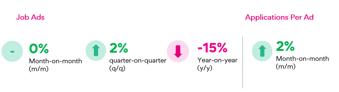 Applications per job ad continue to climb, rising 2% m/m, making for an extremely competitive market for candidates.