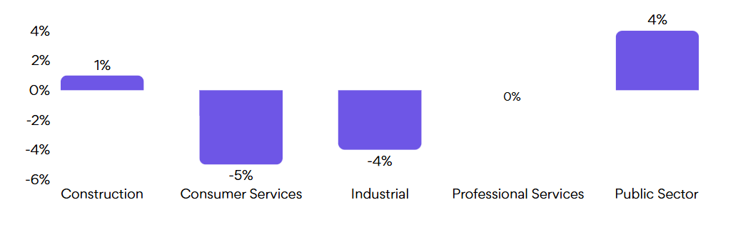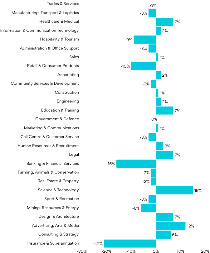 Declines in Hospitality & Tourism (-9%) and Retail & Consumer Products (-10%) among other industries contributed to the Consumer Services sector decline, whereas rises in Healthcare & Medical (7%) and Education & Training (7%) meant growth for the Public sector, in both metro and regional areas.