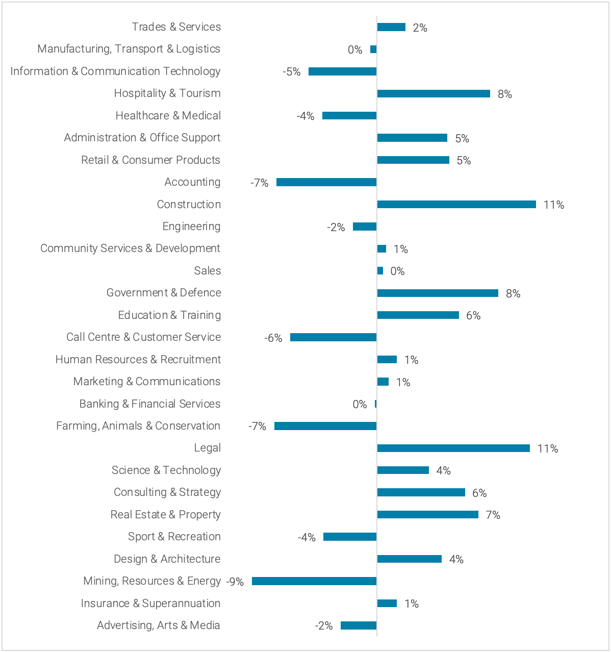The 11% rise in Construction roles was due to demand for Project Management (5%), Plant/ Machinery Operator (1%) and Foreperson/ Supervisory roles (24%).