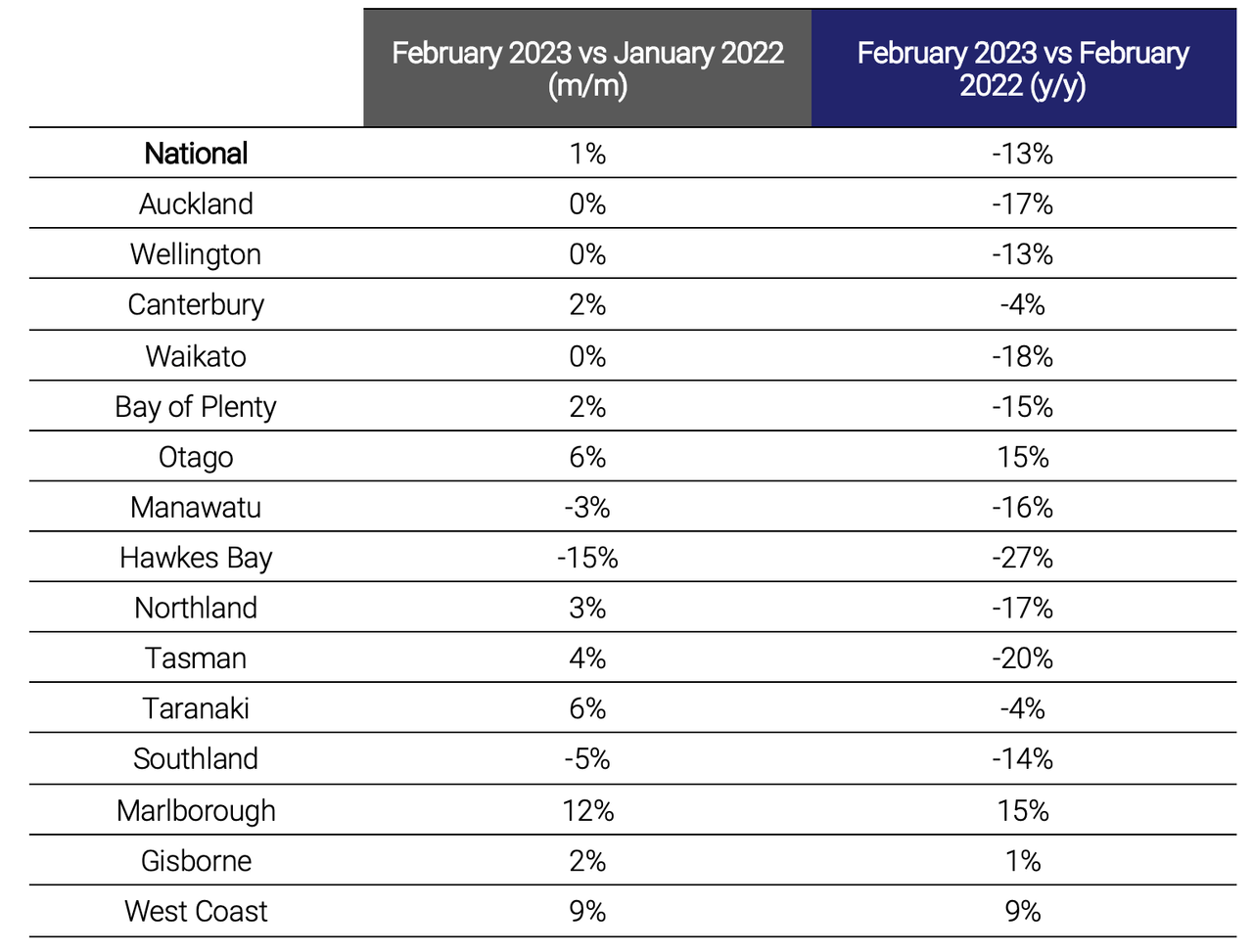 Table 2: National and regional job ad growth/decline comparing February 2023 to: i) January 2023 (m/m) and ii) February 2022 (y/y).