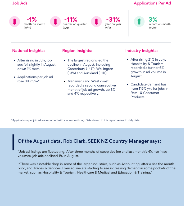 The SEEK Employment Report provides a comprehensive overview of the New Zealand employment marketplace. The report includes the SEEK New Job Ad Index, which measures only new job ads posted within the reported month to provide a clean measure of demand for labour across all classifications. SEEK’s total job ad volume (not disclosed in this report) includes duplicated job advertisements and refreshed job ads. As a result, the SEEK New Job Ad Index does not always match the movement in SEEK’s total job ad volume.