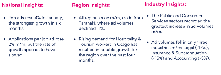 Aside from Taranaki, where volumes fell 11% m/m, all regions recorded job ad growth in January.