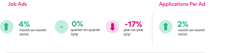 Applications per ad grew the most for Education & Training roles (18%), Call Centre & Customer Service (14%) and Construction roles (12%) m/m.
