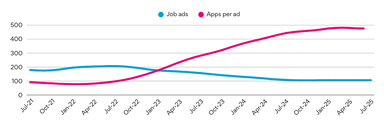 Figure 2: National SEEK job ad and applications per job ad percentage change trend - July 2021 to July 2025. Index = 100 (2013 average).