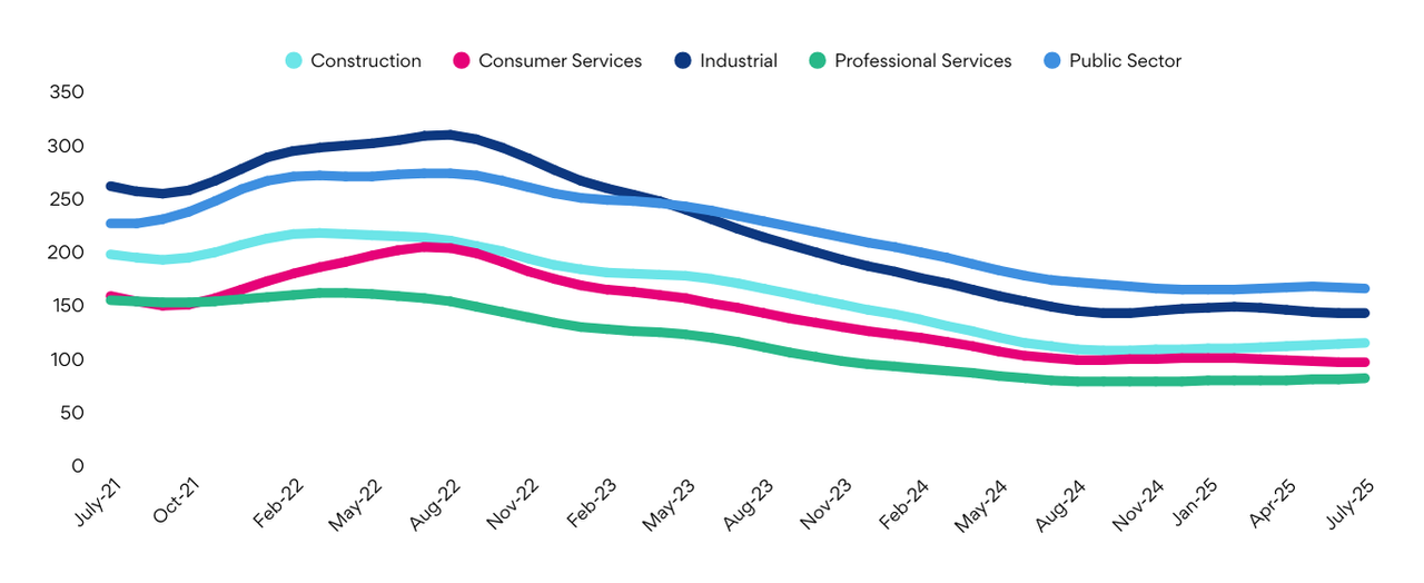 Figure 5: Job ad change over time by sector – July 2021 to July 2025.