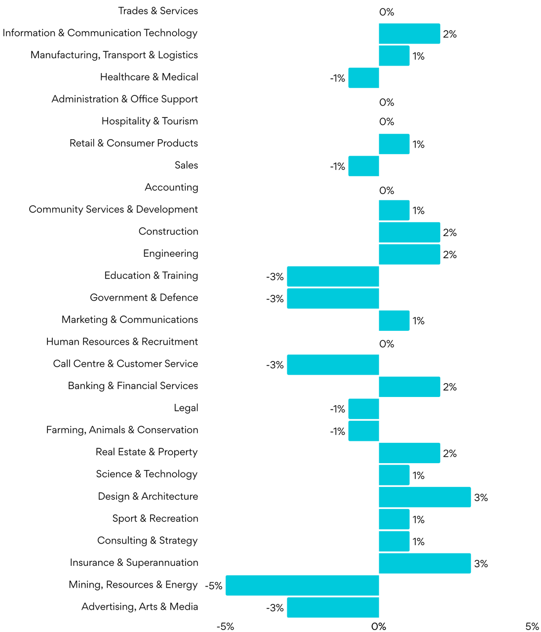 In the Professional Services sector, demand for Insurance & Superannuation workers jumped 3% m/m and has risen steadily over the past quarter. Demand for Information & Communication Technology workers has been growing since November 2024, and rose another 2% in July. Ad volumes increased significantly over the past year for Management (43% y/y), Software Engineers (27% y/y) and Product Management & Developers (27% y/y).