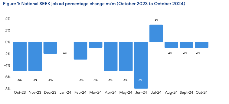 After rising in July, job ads have now fallen for three consecutive months, dropping 1% in October.