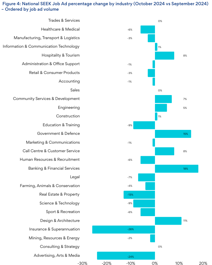 Demand for Government & Defence workers has been on the rise since August, and rose another 15%, in October. Banking & Financial Services (18%) and Community Services & Development (7%) were among the other industries with notable growth in demand m/m.