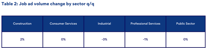 Roles within the Industrial sector (-7%) and the Construction sector (-5%) have recorded the greatest decline q/q. Roles within the Public Sector have also not changed q/q.
