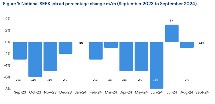 Most of the large industries recorded only marginal growth or decline in September, or no change at all. This was true of Trades & Services (1%), Manufacturing, Transport & Logistics (0%) and Retail & Consumer Products (-1%). Information & Communication Technology also recorded a rare 3% rise in job ads.