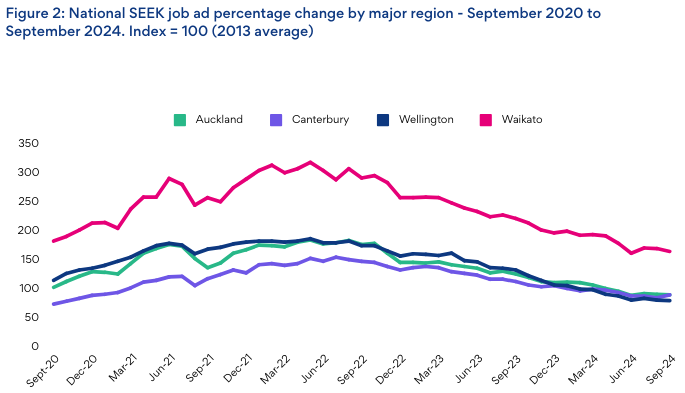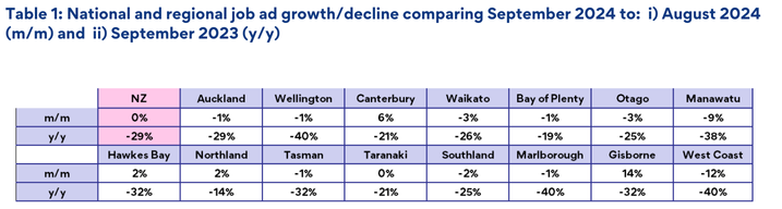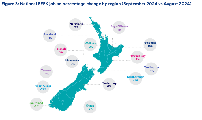 Auckland, Wellington and Bay of Plenty recorded 1% drops in job ads while Waikato and Otago each declined by 3%.
