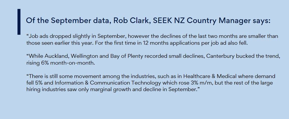The more notable declines in September were in Healthcare & Medical (-5%), Engineering (-11%) and Construction (-8%), but these were offset by growth in some of the Professional Services industries including Insurance & Superannuation (27%), Real Estate & Property (17%) and Legal (11%). The relatively small size of the former two industries do make them prone to fluctuation m/m.