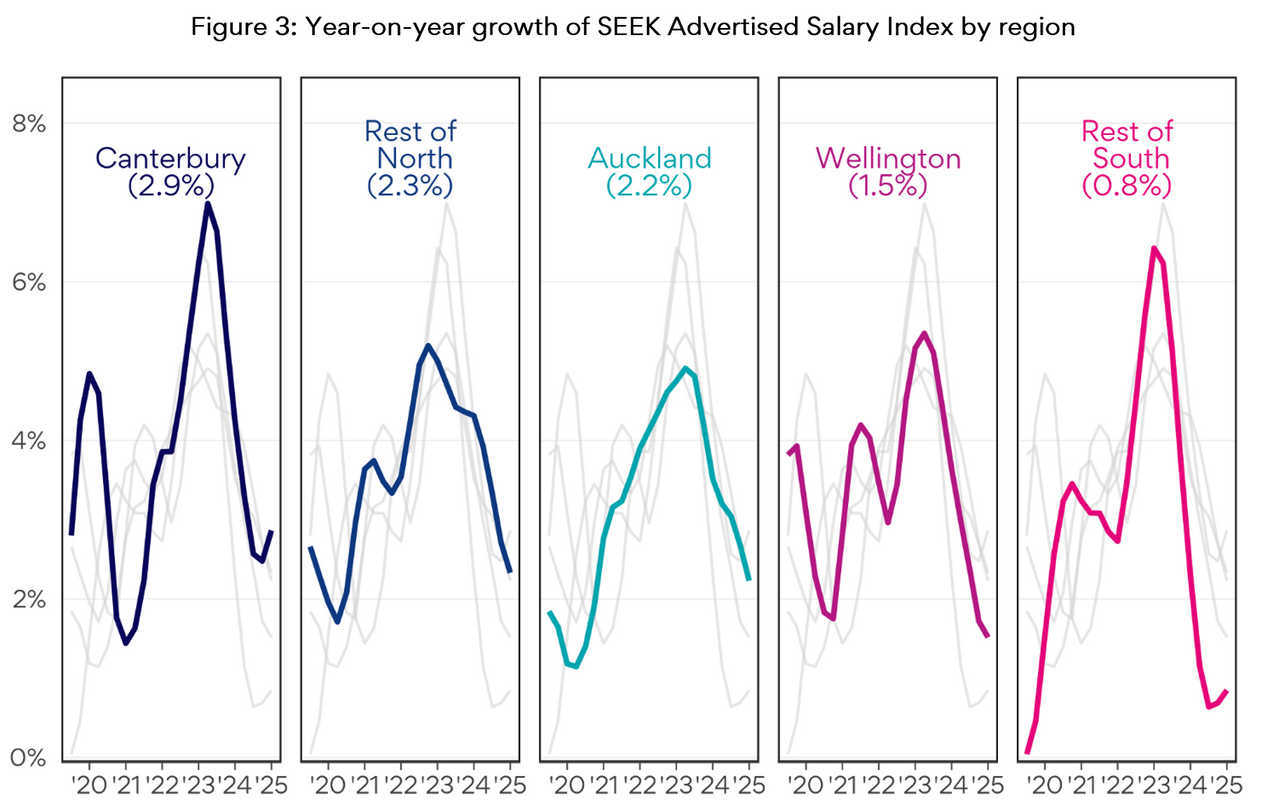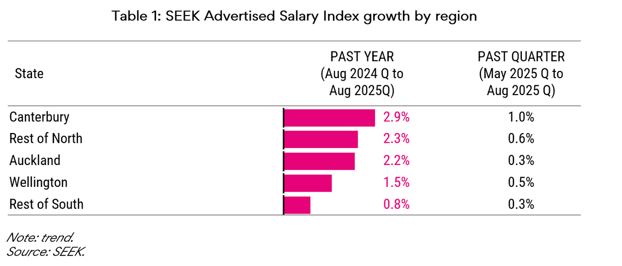 Quarterly and annual average advertised salary growth was fastest in Canterbury at 1.0% q/q and 2.9% y/y.