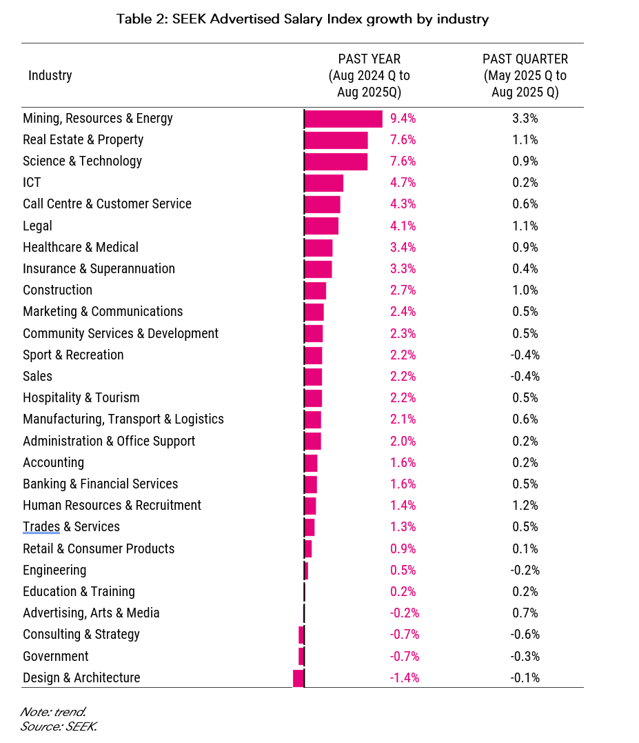 Annual advertised salaries grew fastest in the relatively small Mining, Resources & Energy industry at 9.4% y/y, well above the national average of 2.0%.