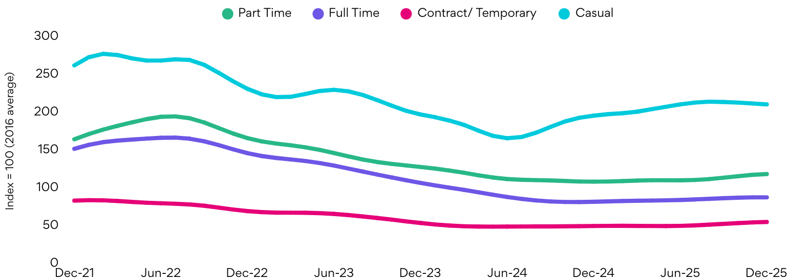 2. Reporting on trend estimates in the SEEK Employment Report rather than seasonally adjusted estimates from August 2025. Trend estimates provide a more reliable guide to the underlying direction of the data and are more suitable than either the seasonally adjusted or original estimates for business decisions. The trend estimates focus on the longer-term underlying trend and are less susceptible to short term movements.Additionally, charts have been indexed to the average of 2016 as opposed to the average of 2013.