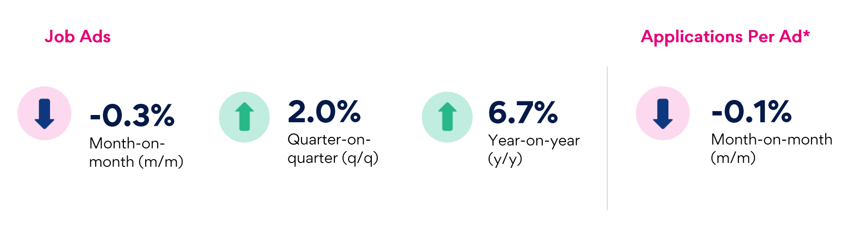 Applications per job ad fell for the second month, dropping slightly by 0.1%.