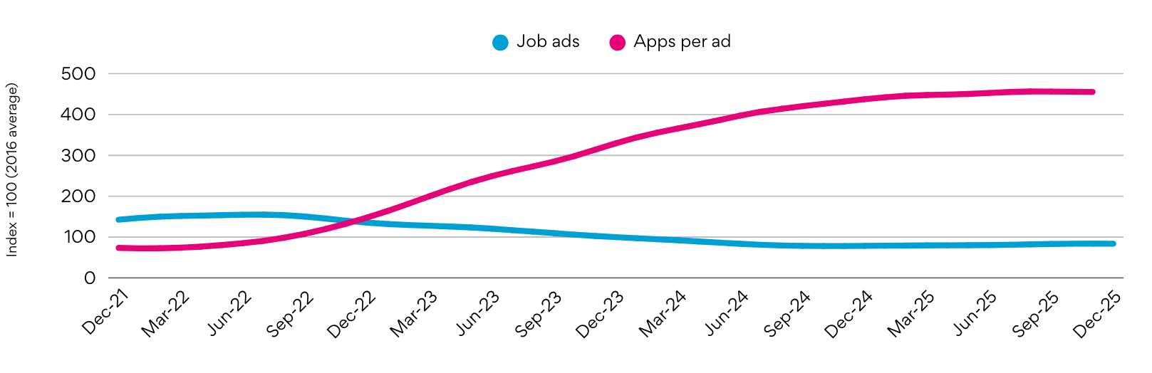 NOTE: In this report job ad and applications per job ad trends data is reported to one decimal place for the period June 2025 – December 2025. Further changes were made to the composition of the data used in these reports, including the inclusion of company listings late last year. See notes at end for more information.