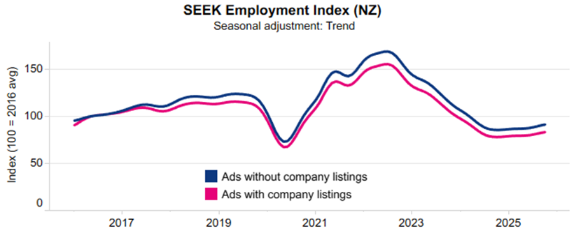 3. The inclusion of company listings into the SEI from November 2025 to better reflect the full range of ad sources on SEEK. Company listings are job ads re-posted by SEEK from other sources and are a small portion of SEEK’s AU and NZ job volumes. The below chart shows the impact of company listings on the index, which are back dated to 2016.