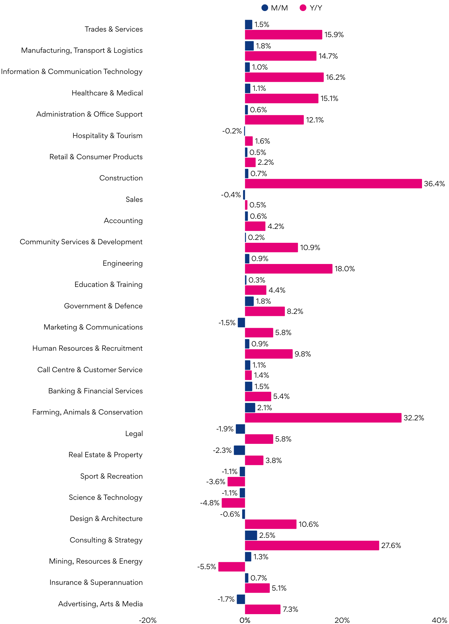 The top five hiring industries all recorded job ad growth m/m, led by Manufacturing, Transport & Logistics (1.8%), Trades & Services (1.5%) and Healthcare & Medical (1.1%).