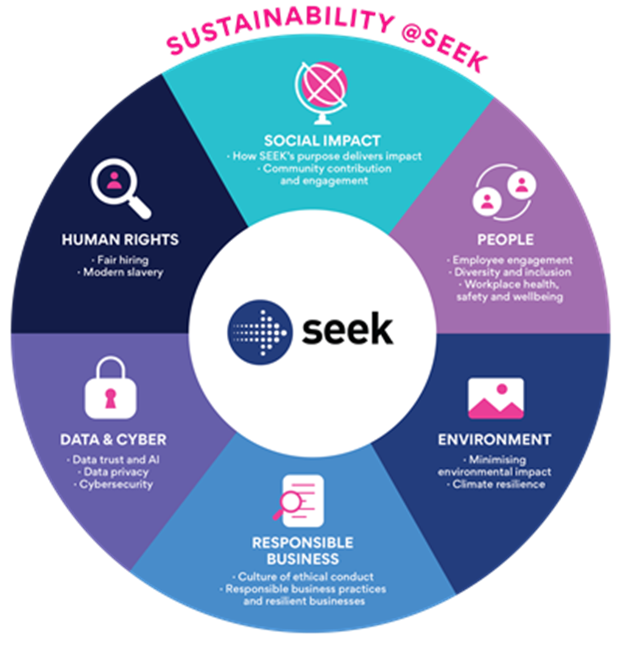 Six key areas reflect SEEK’s approach to sustainability - human rights, social impact, data and cyber, people, environment and responsible business.